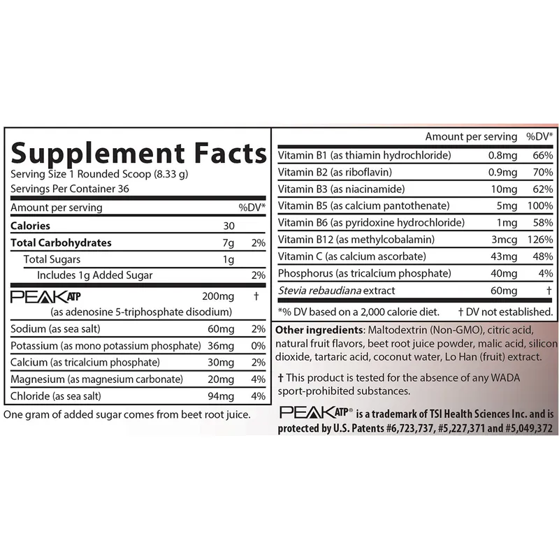 Peak Endurance is a dietary supplement that delivers an oral source of adenosine triphosphate (ATP) combined with six electrolytes, six B vitamins and vitamin C in a blueberry-acai flavored, energy-drink powder.