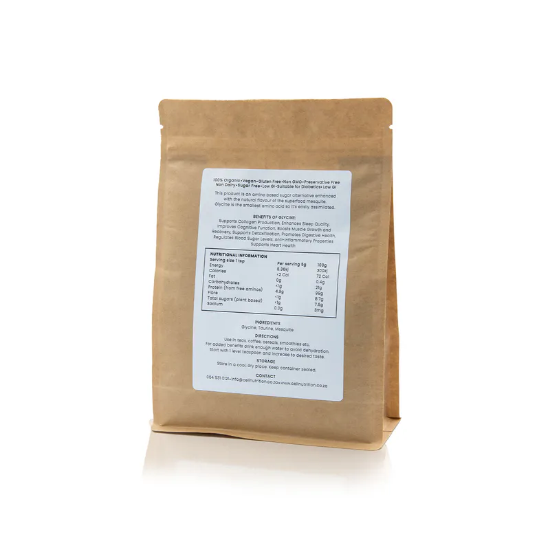 This product is an amino based sugar alternative enhanced with the natural flavour of the superfood mesquite. Glycine is the smallest amino acid so it’s easily assimilated.