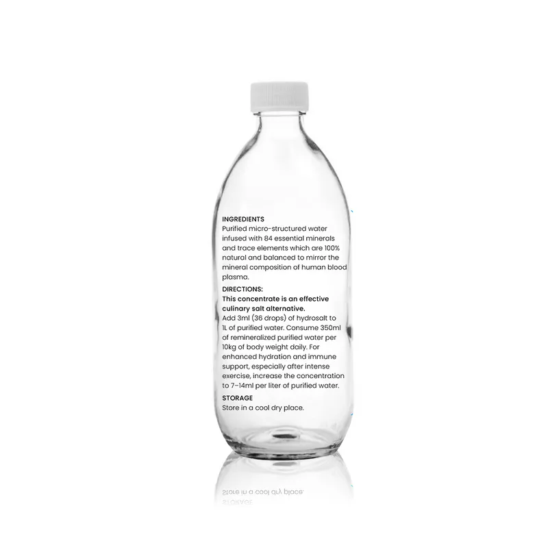 This concentrate is an effective culinary salt alternative. Add 3ml (36 drops) of hydrosalt to 1L of purified water. Consume 350ml of remineralized purified water per 10kg of body weight daily.