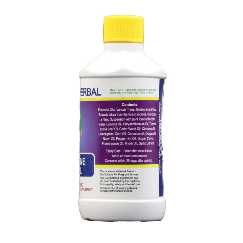 Frankincense & Myrrh Oil, Coconut Oil, Essential Oil of Oregano, Cinnamon Oil, Clove Oil, Citronella Oil, Garlic Extract Oil, Ginger Oil, Neem Oil, Cornmint oil, Turmeric root Oil, Lemon-juice, Honey, Evening Primrose Oil, Borage Oil – Star flower Oil, Lemongrass Oil, Lavender Oil, Cedar Oil, Chrysanthemum Oil, Geranium Oil, Grape Seed Oil, Ionic Mineral Water.
