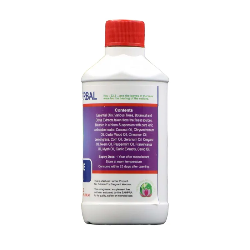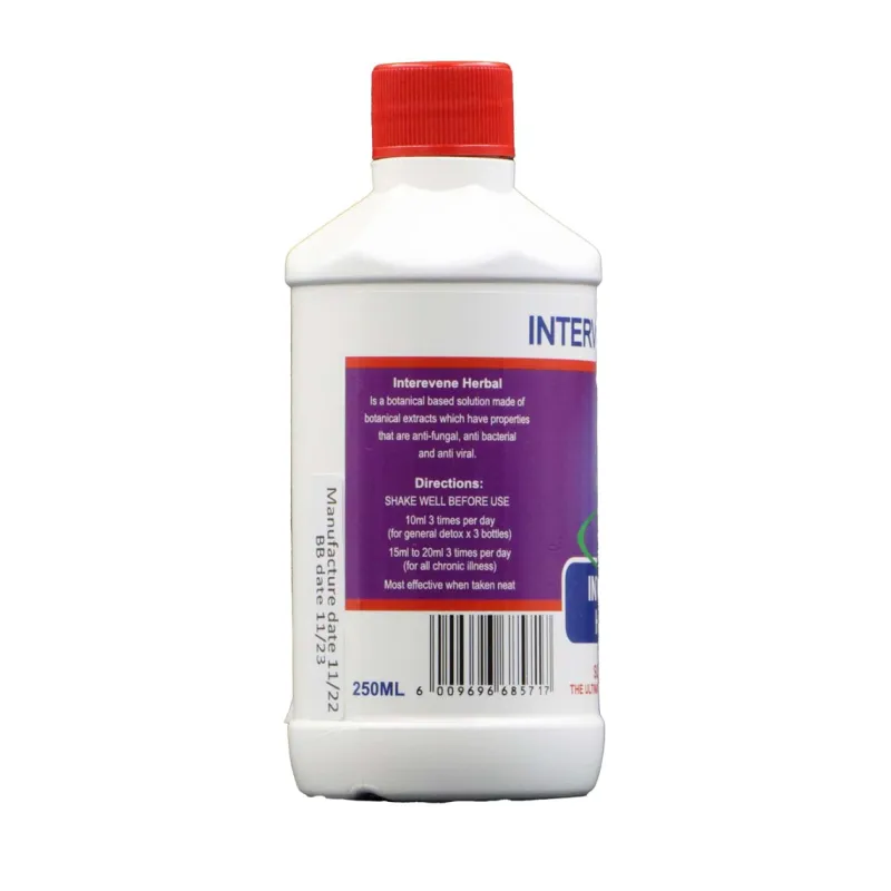 Intervene Herbal Supreme– New improved taste with Carob oil Contrary to our traditional Premium range that contains Borage (Star flower Oil), we have added Carob Oil the this new Supreme blend. Carob Oil is a natural sweetener providing an improved taste with an abundance of additional healing properties. Additional Benefits: Carob oil contains Gallic acid – Ideal for assistance against colon cancer. Carob Oil is high in fiber, helps relieve diarrhea, constipation and contains a good source of anti-oxidants. Carob pods contain bioactive compounds such as dietary fiber, polyphenols, flavonoids, cyclitols, (like d-pinitol) and tannins. These compounds have been associated with a variety of health benefits including, glycemic (blood sugar) control, cholesterol reduction, cancer effects, and many more. Both gallic acid and flavonoids have been shown to reduce oxidative stress. Gallic acid has also been found to scavenge free radicals and may kill cancer cells. Research has shown that flavonoids have anti-inflammatory, may assist against cancer, anti-diabetic, and neuro-protective abilities. Intervene Herbal is a nutritional supplement which may kill bacteria and cleanse the body and blood of toxins. This formula of essential oils may cleanse, regulate and rejuvenate you while it could potentially help to balance your body and optimize your health. It consists of pure essential oils that have proven itself as a potential powerful Antiseptic Bacterial, Anti Viral and Fungal killer which may support the body and detoxify the blood without undesirable side effects. May assists against: Aids support, Arthritis, Cancer (All types), Candida, Chlamydia, Diabetes, Eczema, Emphysema, Glaucoma, Herpes, Immune Booster, Parkinson’s, Prostate, Sores, Skin Acne, STD’s (All types), Stomach Ulcers, Tuberculosis, Tumours, Psoriasis, Scarring, Allergies, Back pain, Bladder infection, Blood infection, Blurred Eye Vision, Infections (general), Inflammation, Gout, Joint pain, Kidney infection, Neuralgic pain, Relieving swelling, Yeast infection, Septic Ulcers, Skin Blemishes, Skin infections, Skin rashes, Spider Bites, Urinary Infection