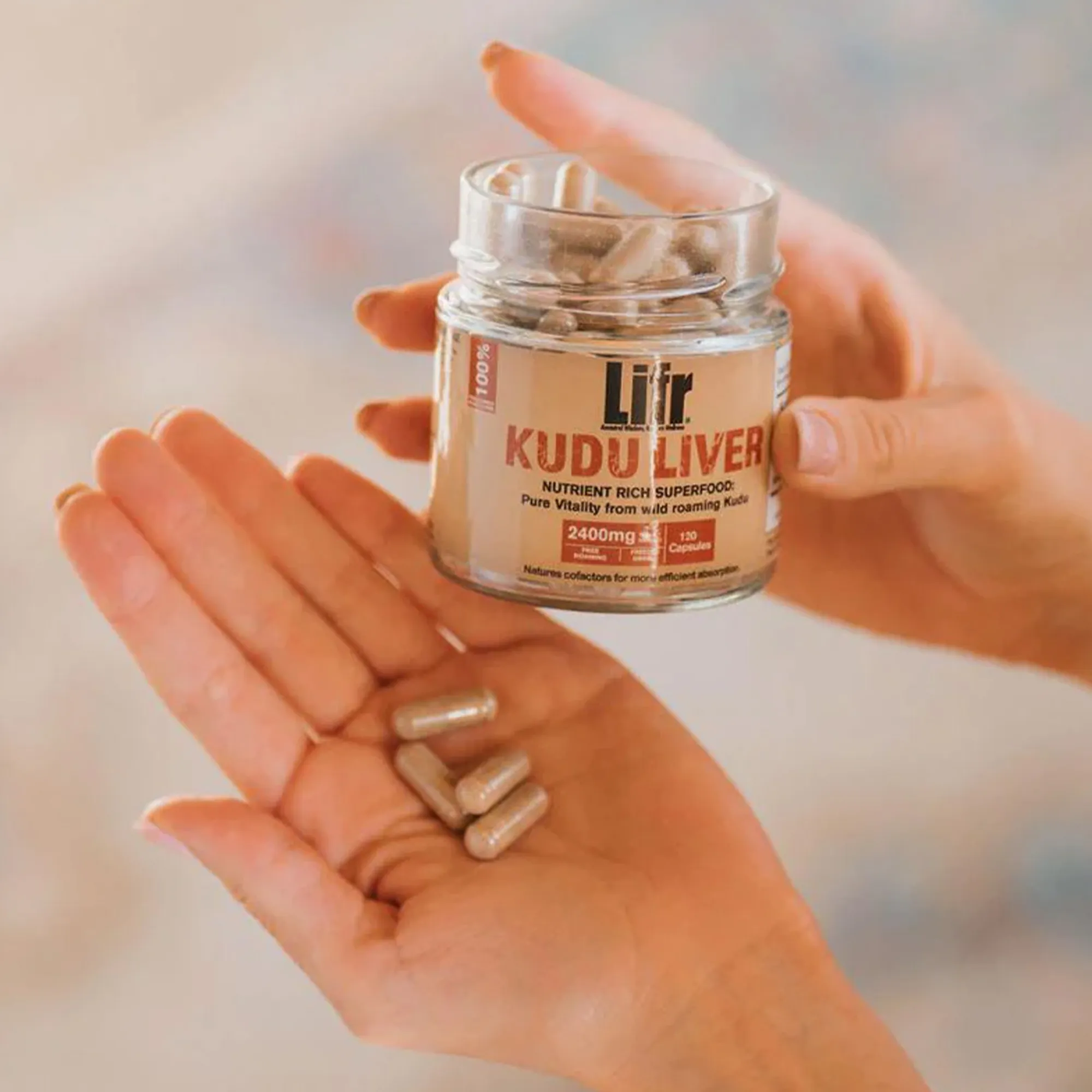 Lifr Kudu Liver Capsules provide a powerful, natural source of essential nutrients derived from pure freeze-dried kudu liver. Sourced from wild African kudu, these capsules deliver a convenient way to enjoy the benefits of one of nature’s most nutrient-dense foods without the taste of liver.