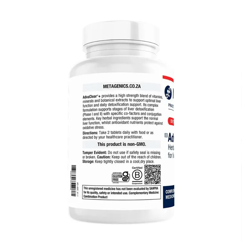 AdvaClear®+ provides a high-strength blend of vitamins, minerals, and botanical extracts to support optimal liver function and daily detoxification. Its complex formulation supports phases of liver detoxification (Phase I and II) with specific co-factors and conjugation elements. Key herbal ingredients support normal liver function, while antioxidant nutrients protect against oxidative stress.