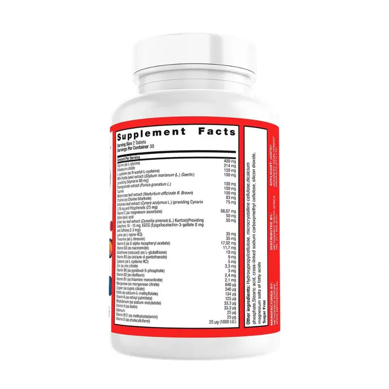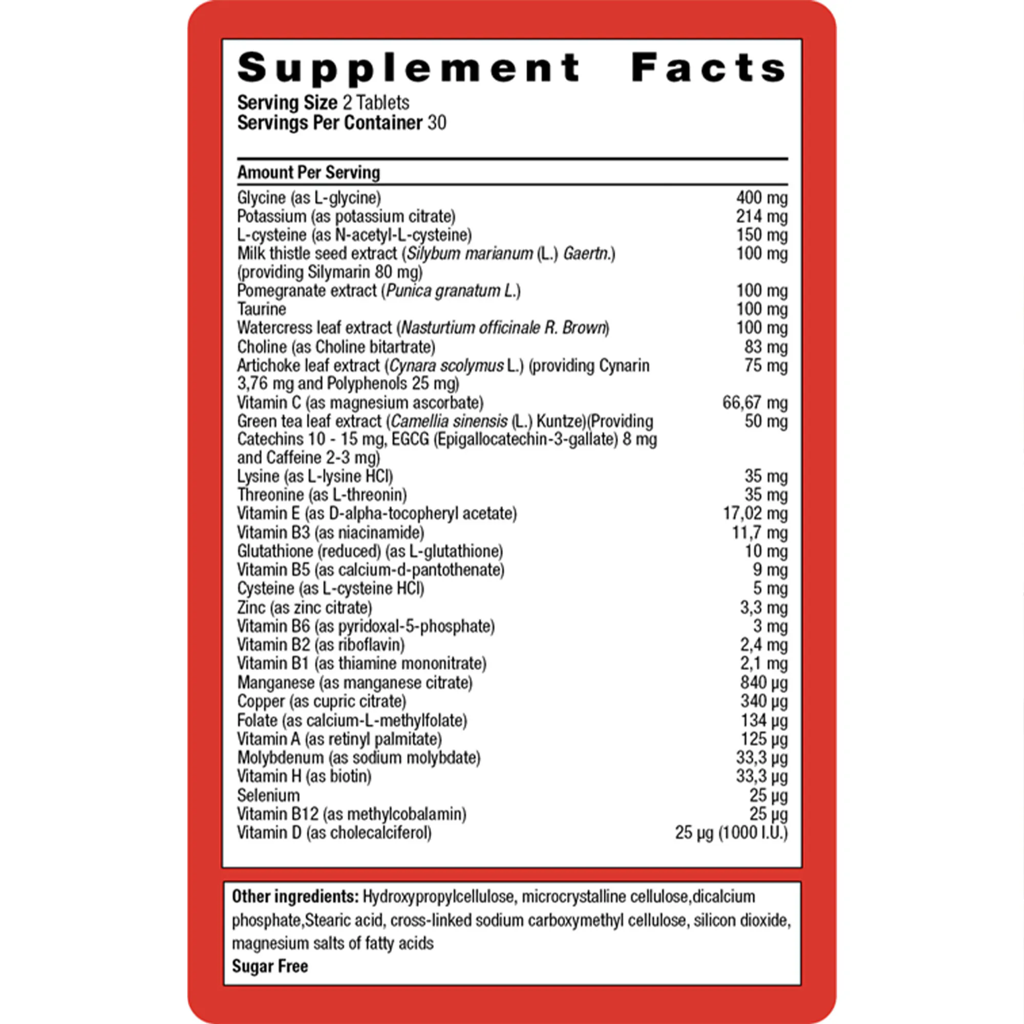Glycine (as L-glycine) 400 mg Potassium (as potassium citrate) 214 mg L-cysteine (as N-acetyl-L-cysteine) 150 mg Milk thistle seed extract (Silybum marianum (L.) Gaertn.) (providing Silymarin 80 mg) 100 mg Pomegranate extract (Punica granatum L.) 100 mg Taurine 100 mg Watercress leaf extract (Nasturtium officinale R. Brown) 100 mg Choline (as Choline bitartrate) 83 mg Artichoke leaf extract (Cynara scolymus L.) (providing Cynarin 3,76 mg and Polyphenols 25 mg) 75 mg Vitamin C (as magnesium ascorbate) 66,67 mg Green tea leaf extract (Camellia sinensis (L.) Kuntze)(Providing Catechins 10 - 15 mg, EGCG 50 mg (Epigallocatechin-3-gallate) 8 mg and Caffeine 2-3 mg) Lysine (as L-lysine HCl) 35 mg Threonine (as L-threonin) 35 mg Vitamin E (as D-alpha-tocopheryl acetate) 17,02 mg Vitamin B3 (as niacinamide) 11,7 mg Glutathione (reduced) (as L-glutathione) 10 mg Vitamin B5 (as calcium-d-pantothenate) 9 mg Cysteine (as L-cysteine HCl) 5 mg Zinc (as zinc citrate) 3,3 mg Vitamin B6 (as pyridoxal-5-phosphate) 3 mg Vitamin B2 (as riboflavin) 2,4 mg Vitamin B1 (as thiamine mononitrate) 2,1 mg Manganese (as manganese citrate) 840 μg Copper (as cupric citrate) 340 μg Folate (as calcium-L-methylfolate) 134 μg Vitamin A (as retinyl palmitate) 125 μg Molybdenum (as sodium molybdate) 33,3 μg Vitamin H (as biotin) 33,3 μg Selenium 25 μg Vitamin B12 (as methylcobalamin) 25 μg Vitamin D (as cholecalciferol) 25 μg (1000 I.U.)